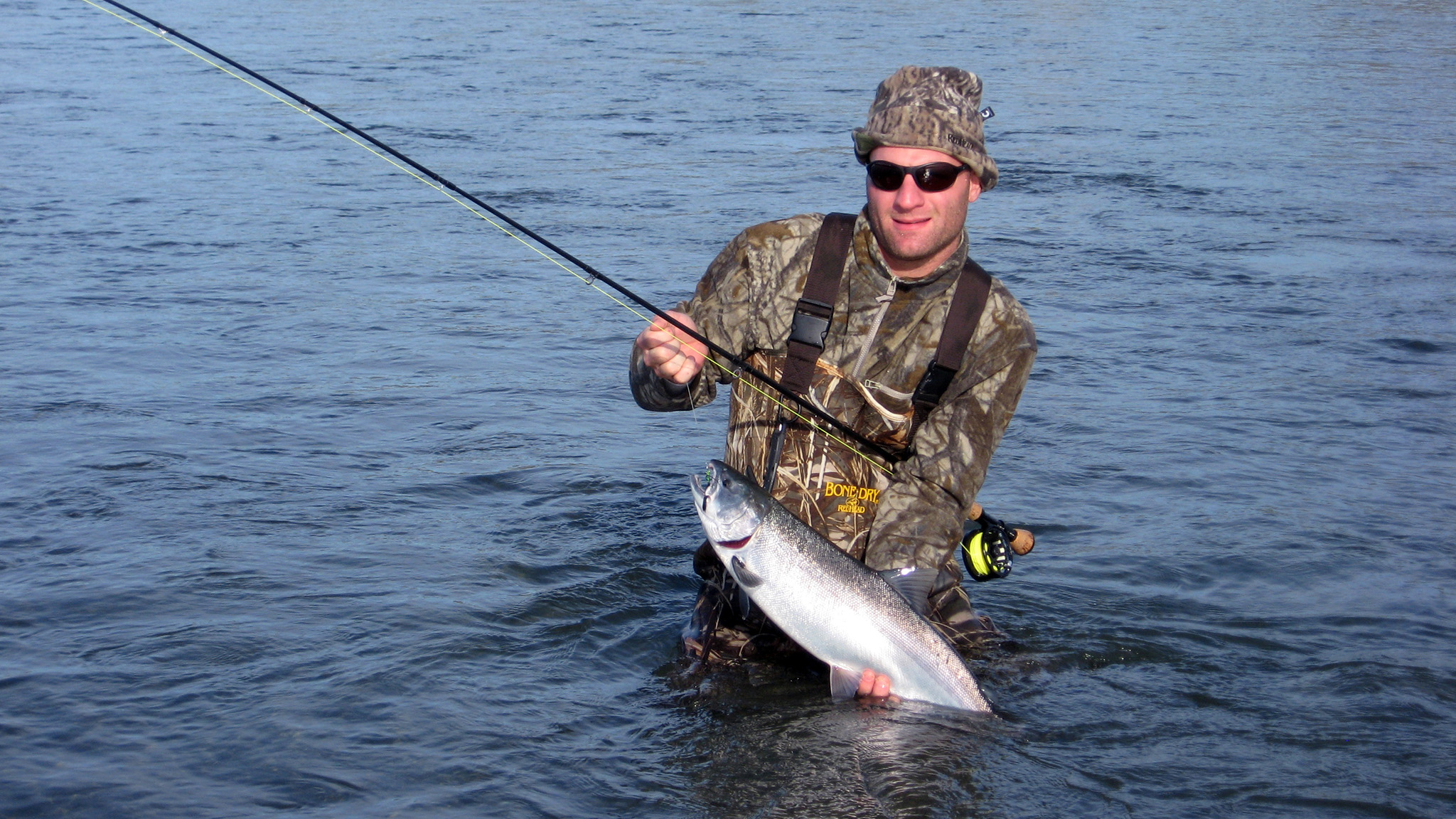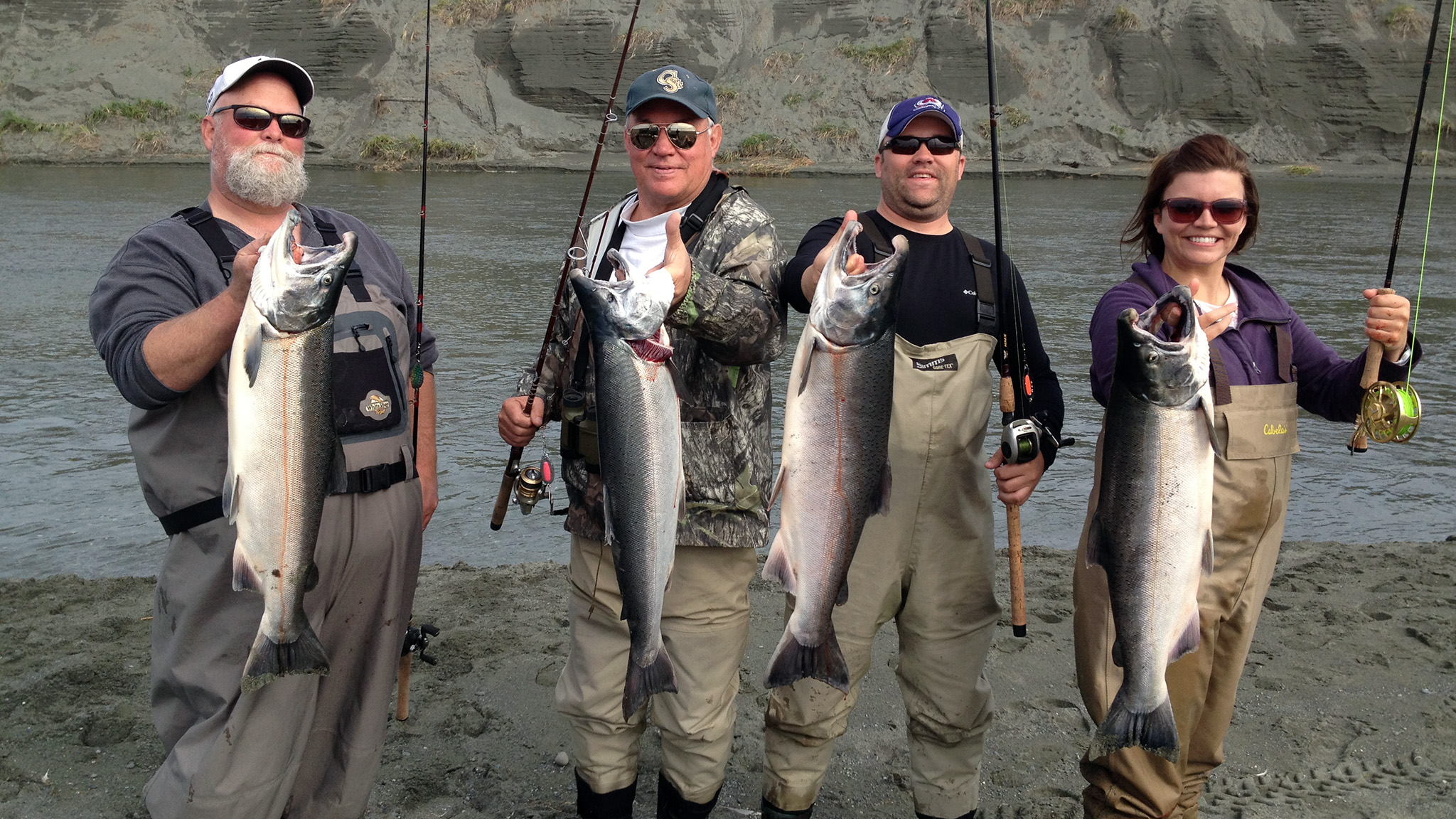 Not only are there a lot of fish but the fish are good sized too running on average from about 10-12 pounds. The Silvers start to show up in August and we fish for them through the middle of October. Silver Salmon tend to congregate in eddies, sloughs and backwater channels off the main current of the River. The Salmon congregate in these areas in large numbers and provide great sport for both fly fishermen and spin casters.